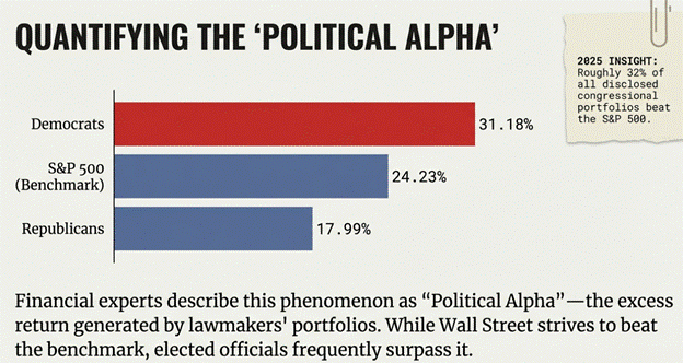 Lawmakers frequently outperform the broader market, tapping into what financial experts have dubbed the “political alpha”. In 2023, for example, Democratic members of Congress averaged a 31.18% return on their investments, while Republicans averaged 17.99%, compared to the S&P 500’s 24.23% return. In 2025, roughly 32% of all disclosed congressional portfolios managed to beat the S&P 500.