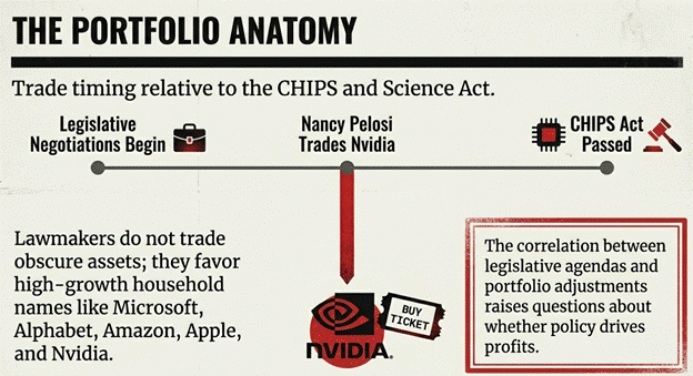 What exactly are they buying? Lawmakers heavily favor household names and high-growth technology stocks, frequently trading shares of Microsoft, Alphabet, Amazon, Apple, and Nvidia. Strikingly, many of these trades perfectly align with legislative action. During the negotiations for the CHIPS and Science Act, several members of Congress, including former House Speaker Nancy Pelosi, actively traded Nvidia, a major semiconductor company.