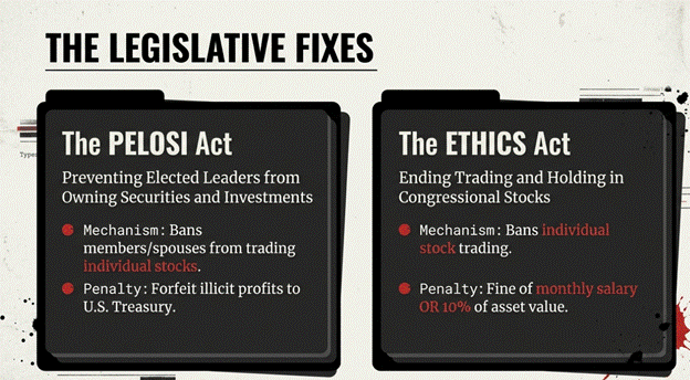 One prominent proposal is the Preventing Elected Leaders from Owning Securities and Investments (PELOSI) Act, which would ban members of Congress and their spouses from holding or trading individual stocks while in office, requiring them to forfeit any illicit profits to the U.S. Treasury. Another piece of legislation, the Ending Trading and Holding in Congressional Stocks (ETHICS) Act, would ban individual stock trading and impose significant fines—either a lawmaker’s monthly salary or 10% of the value of the assets—for failing to divest.