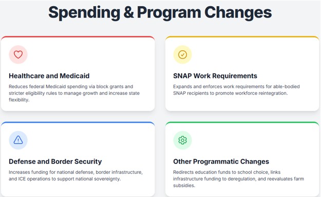 - Healthcare and Medicaid: The bill reduces federal Medicaid spending through block grants to states or stricter eligibility rules. This manages healthcare entitlement growth and offers states greater flexibility.