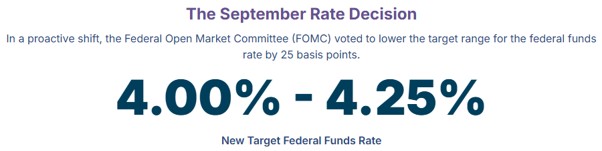 On September 17, 2025, the Federal Open Market Committee (FOMC) began a monetary easing cycle by lowering the target range for the federal funds rate by 25 basis points, setting it at 4.00%−4.25%. This marks the first rate reduction of 2025, following a pause in the first half of the year and 100 basis points of cuts in Q4 2024. Federal Reserve Chair Jerome Powell stated that this decision was a risk management measure, primarily in response to a significant decline in the U.S. labor market, despite ongoing high inflation.