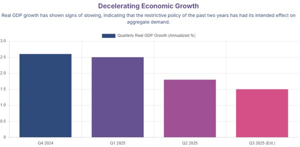 - Moderating Economic Activity: Real GDP growth slowed to an annualized pace of approximately 1.5% in the first half of 2025, a decrease from 2.5% in the previous year, mainly due to a moderation in consumer spending.