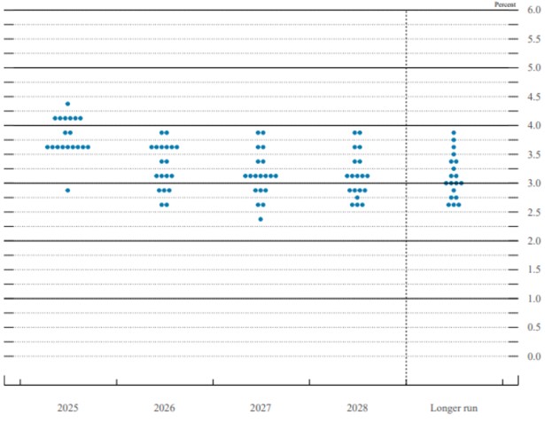 - Inflation Outlook: Total PCE inflation is projected at 3.0% for 2025, decreasing to 2.6% in 2026 and 2.1% in 2027. The Fed does not anticipate inflation returning to its 2% target until 2028.