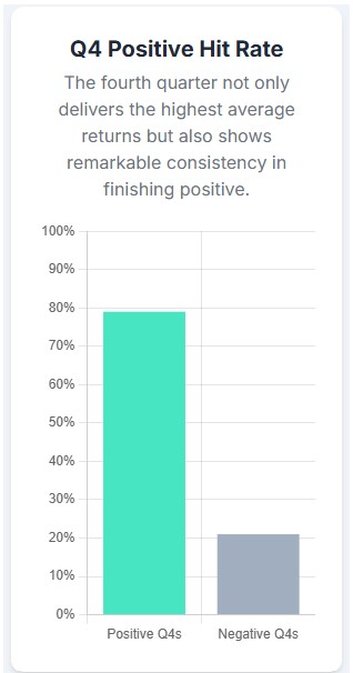 The fourth quarter (Q4) consistently demonstrates strong performance in U.S. equities, outperforming all other quarters. Fixed income assets tend to lag in this period while diversifying and non-standard assets can outperform.