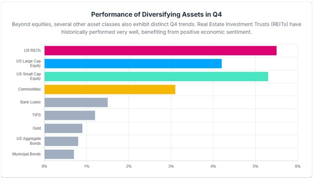 The effect is not uniform; small-capitalization stocks and growth-oriented equities show the most significant Q4 returns. In contrast, fixed income and other rate-sensitive assets demonstrate more conditional Q4 performance, largely tied to macroeconomic conditions and monetary policy expectations rather than consistent seasonal patterns. Similarly, diversifying assets such as commodities and gold exhibit varied trends based on economic sentiment.