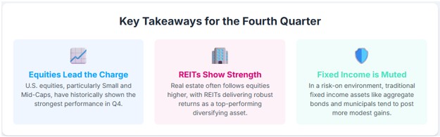 Real Estate Investment Trusts (REITs): As a “hybrid asset,” REITs are sensitive to both equity market sentiment and interest rates. Being publicly traded equities, REITs benefit from the same “risk-on” appetite that frequently drives the broader stock market higher in Q4. However, as high-dividend-paying instruments, they directly compete with fixed income, making them highly sensitive to changes in Treasury yields. The significant -8.2% decline in the FTSE All Equity REIT Index in Q4 2024 illustrates their sensitivity to rising rates. An ideal Q4 environment for REITs would feature steady economic growth combined with stable or falling interest rates.