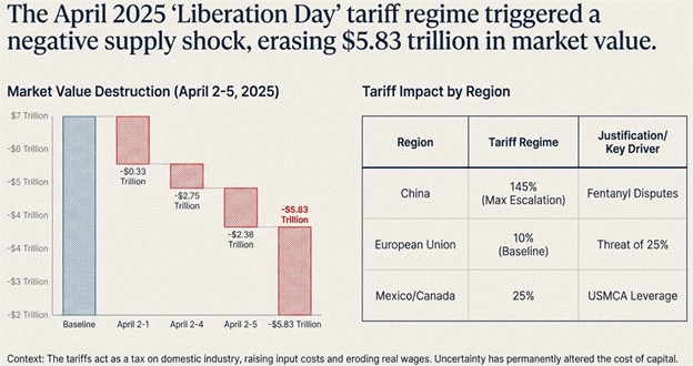 On April 2, 2025, the administration announced the “Liberation Day” tariffs; a 10% baseline tax on nearly all imports designed to protect domestic manufacturing. The market reaction was, to put it mildly, violent. The S&P 500 lost approximately $5.83 trillion in value over just four days, marking the steepest losses since the 1950s. Investors quickly realized that while these tariffs might help specific industries, they acted as a negative supply shock that would raise costs for companies and prices for consumers.