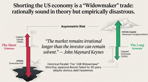 In trading, a “widowmaker” is a bet that looks perfect on paper but crushes anyone who tries to execute it because the market remains irrational longer than the trader can stay solvent. For decades, shorting Japanese government bonds was the ultimate widowmaker. Today, shorting the U.S. economy is taking that title.