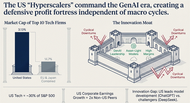 The U.S. is not just another economy; it is the engine of global innovation. The GenAI era is dominated by American hyperscalers, companies like, Nvidia, Microsoft, Alphabet, Apple and Tesla that hold massive cash reserves and dominate global profit pools. While Europe and Japan struggle to foster deep venture capital ecosystems, the U.S. consistently leads in R&D and tech capability. Even if the macro picture looks bleak, these companies have defensive properties because they are so profitable and essential to the global economy.