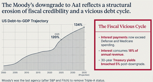 Underlying these events is the boring but dangerous reality of the federal balance sheet. In January 2026, Moody’s downgraded the U.S. credit rating to Aa1, citing a projected debt-to-GDP ratio of 134% by 2035. With interest payments consuming 18% of revenue, the bond market began to fear a “non-linear repricing”, fancy talk for interest rates spiraling upward because there is simply too much debt to sell.