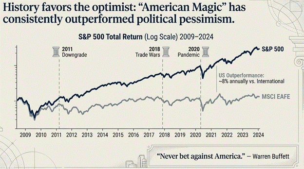 It is always helpful to check in with the Oracle of Omaha. Warren Buffett has famously maintained that “American magic has always prevailed” and that for 240 years, betting against the U.S. has been a “terrible mistake.” His view is that the country’s “golden goose of commerce and innovation” will continue to produce wealth regardless of who is in the White House or what the short-term policy headwinds are.