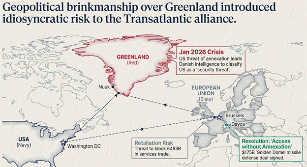 Just as markets were adjusting to trade friction, January 2026 brought a geopolitical stress test. Tensions flared over a diplomatic confrontation regarding the potential American annexation of Greenland. When the U.S. refused to rule out military force, it rattled the Transatlantic alliance to its core. The EU threatened retaliation, and for the first time, Danish intelligence classified the U.S. as a potential security threat. This introduced “idiosyncratic risk” into U.S. markets; essentially, the fear that American foreign policy had become too erratic to trust.