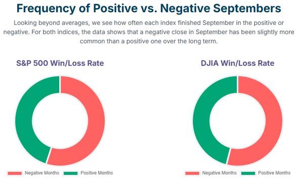 • S&P 500: September’s “win rate” since 1928 is only 45%, significantly lower than the 61% for other months.