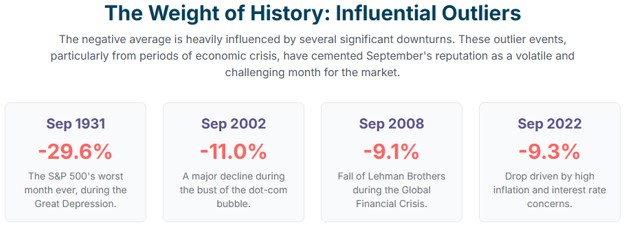 While extreme events heavily influence the long-term average, the high frequency of negative returns (55% of all Septembers) suggests a persistent underlying weakness. These outlier events exacerbate an already existing statistical weakness rather than being the sole cause.