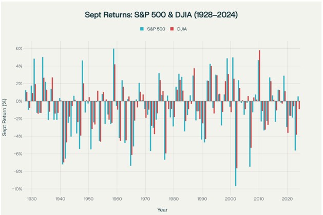 • S&P 500: Average September returns range from -1.1% to -1.2% since 1928.