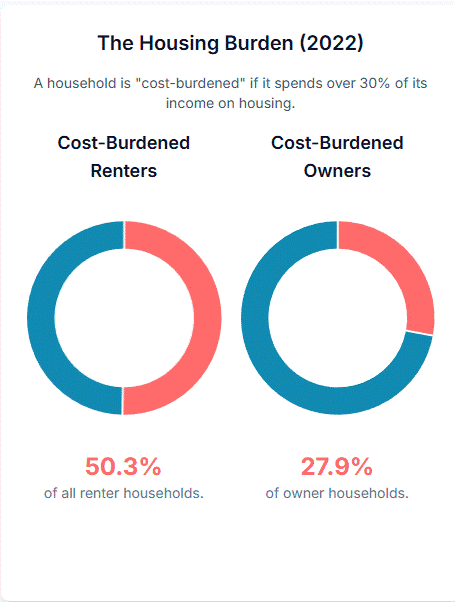 - Widespread Cost Burden: The situation is severe for the 35% of households who rent. In 2023, nearly half (49.5%) of all renter households were classified as “cost-burdened,” meaning they spent more than 30% of their income on rent.
