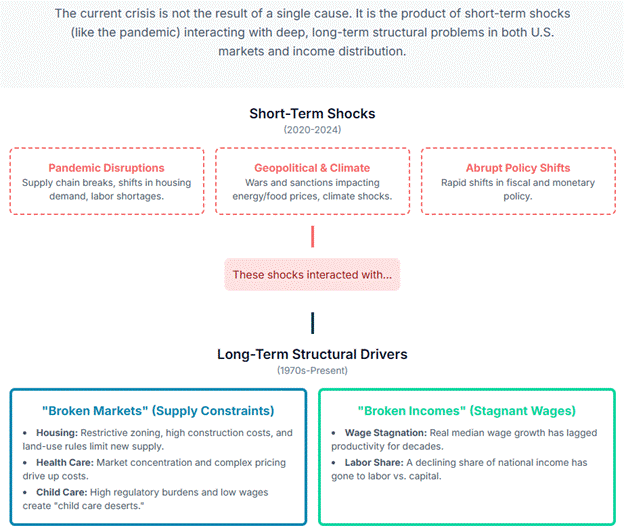 The current affordability crisis is fundamentally distinct from prior economic downturns, such as the Great Inflation of the 1970s and the 2008 housing collapse. These differences are rooted in key historical shifts.
